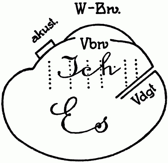 Die Wortreste stammen wesentlich von akustischen Wahrnehmungen ab, so daß hiedurch gleichsam ein besonderer Sinnesursprung für das System Vbw gegeben ist. Die visuellen Bestandteile der Wortvorstellung kann man als sekundär, durch Lesen erworben, zunächst vernachlässigen und ebenso die Bewegungsbilder des Wortes, die außer bei Taubstummen die Rolle von unterstützenden Zeichen spielen. Das Wort ist doch eigentlich der Erinnerungsrest des gehörten Wortes.