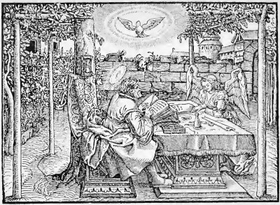 - ↑ Es folgt die Abbildung des Titelblatts zu diesem Neuen Testament und des über dem »Evangelion Sanct Matthes« stehenden Bildes, welches den schreibenden Evangelisten in gut deutscher Umgebung darstellt.